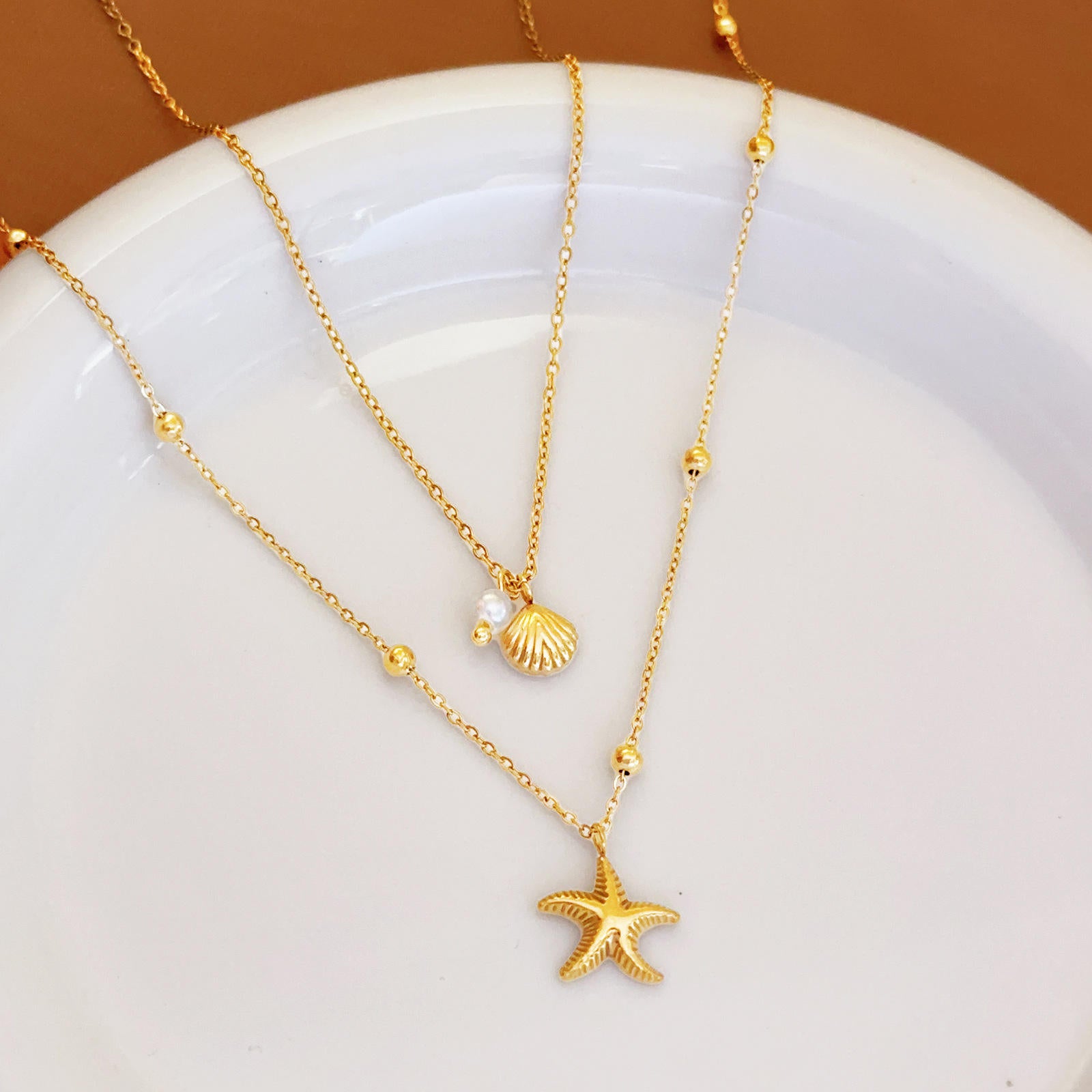 Shell Starfish Double Layer Necklace - 18k Gold Plated